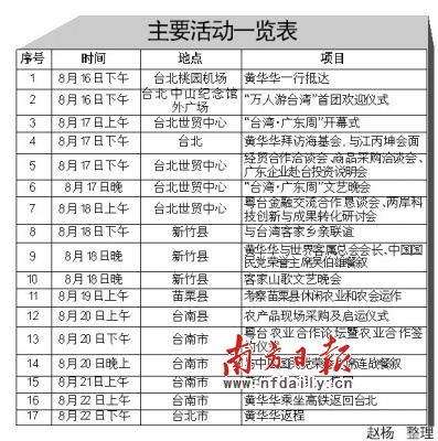 ●2010年8月16日,廣東省省長(zhǎng)黃華華帶隊(duì)赴臺(tái)灣舉行“臺(tái)灣·廣東周”活動(dòng)。活動(dòng)主題為“合作之旅、鄉(xiāng)情之旅”,內(nèi)容包括經(jīng)貿(mào)合作、商品采購(gòu)、旅游合作、農(nóng)業(yè)合作、文化交流、宣傳亞運(yùn)等,當(dāng)日還將舉行“萬(wàn)人游臺(tái)灣”首團(tuán)啟動(dòng)儀式。 (記者 陶達(dá)嬪 鄧紅輝)