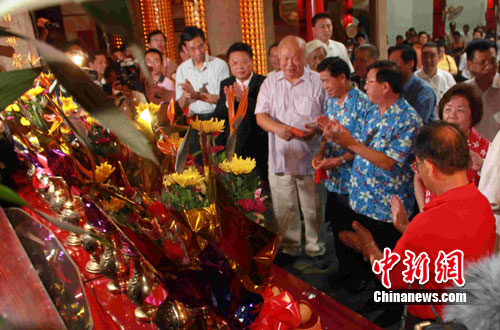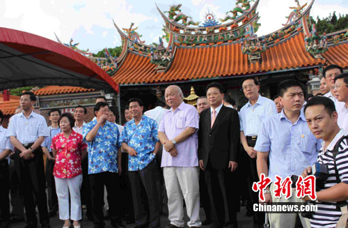 中新網(wǎng)新竹8月18日電(記者 張傳熙)率領(lǐng)廣東省經(jīng)貿(mào)文化交流團(tuán)訪臺(tái)的黃華華省長今天下午從臺(tái)北抵達(dá)新竹縣展開尋親、訪友的“鄉(xiāng)情之旅”。下午,在新竹縣領(lǐng)導(dǎo)人邱鏡淳及眾多鄉(xiāng)親的陪同下,黃華華到當(dāng)?shù)卮砜图椅幕牧x民廟行禮、祭拜。