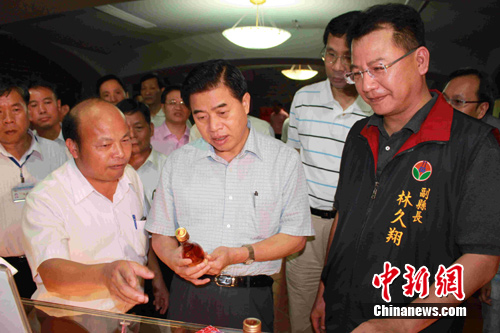 中新網(wǎng)苗栗8月19日電 廣東省省長黃華華率領(lǐng)的廣東經(jīng)貿(mào)文化交流團主圖19日從新竹抵達苗栗縣參觀訪問。黃華華在當(dāng)?shù)仡I(lǐng)導(dǎo)人的陪同下參觀了農(nóng)莊、當(dāng)?shù)靥禺a(chǎn)銷售商場。當(dāng)看到當(dāng)?shù)赜貌葺庸ぶ圃斓牟葺称妨宅槤M目,充滿貨架時大為贊賞,稱贊苗栗“了不得”。圖為黃華華在苗栗領(lǐng)導(dǎo)人的陪同下,觀看正在發(fā)售中的草莓酒。