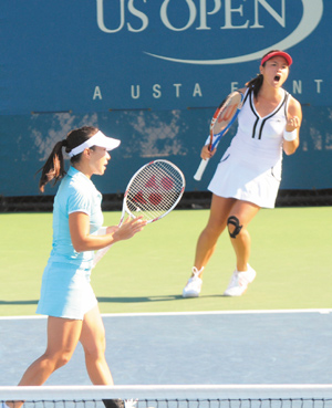 中新網(wǎng)9月9日電 臺(tái)灣《聯(lián)合報(bào)》今日?qǐng)?bào)道說(shuō),“潔然配”的大陸鄭潔及臺(tái)灣詹詠然,昨天勇闖美國(guó)網(wǎng)球公開(kāi)賽女雙四強(qiáng),追平兩岸女雙組合在大滿貫賽最佳成績(jī),繼續(xù)向前挺進(jìn)。