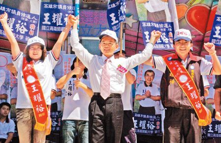為防“棄黃保楊”效應發(fā)生,金溥聰日前下令禁止黨籍民意代表與楊秋興“私通”,然而,國民黨提名的市議員參選人王耀裕昨日成立競選總部,卻邀楊秋興到場并站臺。