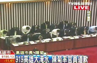中新網(wǎng)9月28日電 據(jù)臺灣TVBS報道,針對919“凡亞比”臺風(fēng)造成高雄市大淹水,市長陳菊連日來遭到相當(dāng)多的指控,今日,在市議會總質(zhì)詢時,陳菊特別率領(lǐng)市府官員向市民道歉。