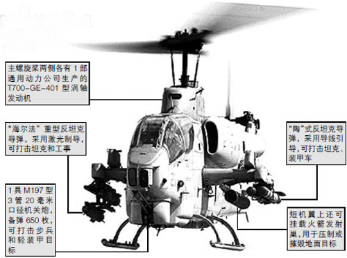 AH-1W武裝直升機(jī)機(jī)長(zhǎng)約18米,高4米,最大起飛重量近6700公斤,采用串列座艙設(shè)計(jì),由2名機(jī)組成員操控,裝備有機(jī)關(guān)炮、火箭彈、空空導(dǎo)彈和反坦克導(dǎo)彈,是目前臺(tái)軍直升機(jī)部隊(duì)中攻擊力最強(qiáng)的機(jī)型。(何西)