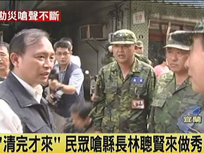 昨天天氣短暫放晴,宜蘭縣長(zhǎng)林聰賢巡視淹水災(zāi)區(qū),卻出現(xiàn)不尋常的現(xiàn)象,幾乎走到哪就被罵到哪,一名民眾說(shuō),都淹了好幾天了,還是靠著臺(tái)北的女兒上網(wǎng)把淹水的情況公布給大家知道,縣長(zhǎng)這個(gè)時(shí)候才到。也有老婦人說(shuō),淹水的時(shí)候看不到縣政府的人員前來(lái),還不是靠著自己的力量清理家園,都快清得差不多了,縣長(zhǎng)才出現(xiàn)。