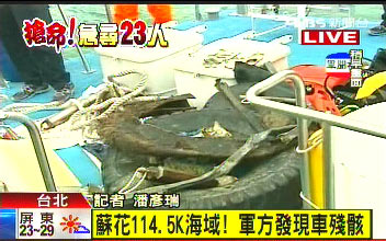 臺當(dāng)局“國防部”表示,今日上午9時40分左右,在蘇花公路114.5公里距灘10米、水深6米處,發(fā)現(xiàn)一個大型輪胎外胎與一個半內(nèi)胎、 規(guī)格為50厘米乘以50厘米的藍(lán)色皮革,疑似車體內(nèi)裝;上午10時40分,又發(fā)現(xiàn)長約2米的疑似車體支架。