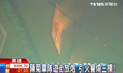 中新網(wǎng)11月24日電 據(jù)臺(tái)灣“中廣新聞”報(bào)道,民進(jìn)黨高雄市長(zhǎng)候選人陳菊23日傍晚到高雄縣梓官鄉(xiāng)車隊(duì)掃街拜票,支持者和車隊(duì)沿途猛放鞭炮,沖天炮四處亂竄,結(jié)果,飛沖到光明路一家電子專賣店三樓,導(dǎo)致這家電子專賣店三樓失火,火勢(shì)并且迅速延燒到隔壁兩間民宅的三樓,消防局出動(dòng)七輛消防車前往搶救,近一小時(shí)才將火勢(shì)完全撲滅。