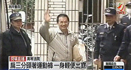 陳水扁手上拿著黃色牛皮紙袋裝的卷宗,露出微笑并向在場(chǎng)媒體揮手致意,在戒護(hù)人員陪同下快速步入高院。
