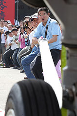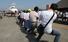 員工組則顯得有備而來,穿著整齊制服,當(dāng)30十名選手還拉不動(dòng)時(shí),遠(yuǎn)航董事長(zhǎng)樂大信和總經(jīng)理陳尚群也加入拔河,直到40人終于拖動(dòng)飛機(jī),多位選手大呼好玩。