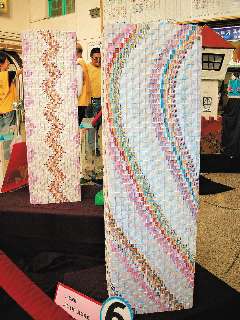 臺南高商廣告設計商、當?shù)亟處焺t與學生共同創(chuàng)作,提供五項作品參展,分為鳳凰花和安平古堡等造型。府城舊冊店家潘靜竹則以“愛心久久”為題,將發(fā)票箱點綴成美麗少女。