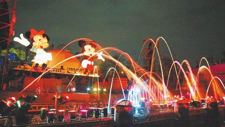 一等主舞臺背景音樂響起,軌道兩側(cè)的米老鼠主燈,緩緩向舞臺中央靠攏,水舞與燈光迸射而出,在漆黑的夜空中令人驚艷,不少民眾為此歡呼連連,測試時間約十五分鐘。