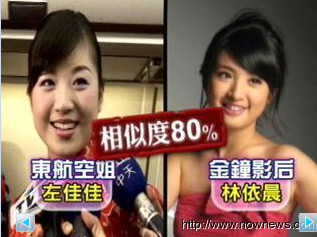 身穿紅藍色旗袍,空姐們一字排開,她們都是參與直航包機、由航空公司精挑細選出的美麗代表,仔細看,一位笑容甜美的空姐是不是很像誰呢?東航空姐左佳佳說,乘客說她長得像林依晨,她也覺得自己笑起來的樣子挺像的。其實左佳佳不只是笑容,她彎彎的眼睛,還有圓潤的臉型,跟林依晨至少有80%相似程度。