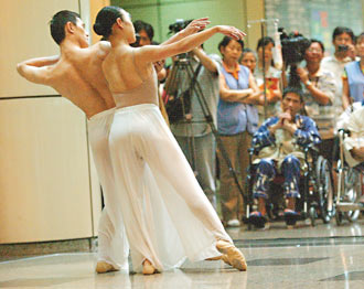 云門舞集成立已經(jīng)三十五周年,在全臺(tái)十九家醫(yī)院推出“醫(yī)院里的春天”巡演,把舞臺(tái)搬到醫(yī)院。臺(tái)大醫(yī)院昨天過(guò)113周年生日,云門舞者帶來(lái)“水月”的精華片段,沒有另外搭舞臺(tái),沒有燈光,在樸實(shí)的醫(yī)院大廳上演最真實(shí)的感動(dòng),駐足的觀眾把舞者團(tuán)團(tuán)圍住,還有病人坐著輪椅觀賞。