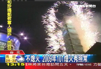 堅(jiān)持續(xù)辦煙火,但是受到不景氣影響,本來101大樓應(yīng)該在10月底就該定案決定贊助廠商,但直到現(xiàn)在都找不到贊助人選。2005年101大樓落成,舉辦了88秒的煙火秀,2006、2007則是由國際贊助商Sony舉辦了188秒的煙火秀,今年是交給臺(tái)“觀光局”辦理,但到了2009年,“獎(jiǎng)落誰家”還是個(gè)未知數(shù)。