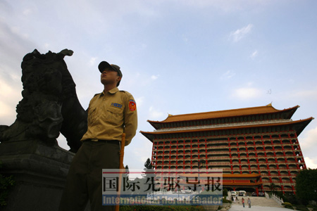 國際先驅(qū)導報特約撰稿沈宇哲發(fā)自上海 在臺北,有一座中國宮殿式建筑,它高達14層,隨處可見七彩畫梁、丹朱圓柱和琉璃金瓦。依傍基隆河、高聳于劍潭山之腰的它,正是海協(xié)會會長陳云林此次赴臺下榻的臺北圓山大飯店。