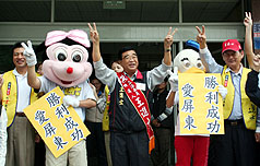 國民黨“立委”參選人羅世雄抽中簽王,也由吉祥物陪同高喊“一定當(dāng)選”造勢。