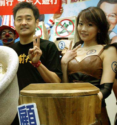 國民黨的全民大游行活動(dòng)訊息現(xiàn)場(chǎng)邀請(qǐng)模特兒展示游行大隊(duì)的主題;民進(jìn)黨的活動(dòng)上參加活動(dòng)年輕人在臉上寫“勝”字挺謝長(zhǎng)廷。