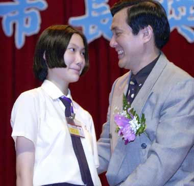 2001年,時(shí)為臺(tái)北市長(zhǎng)的馬英九頒發(fā)市長(zhǎng)獎(jiǎng)給各“國(guó)中”優(yōu)秀畢業(yè)生,當(dāng)頒發(fā)給自己的小女兒馬元中時(shí)樂(lè)得將他拉進(jìn)自己的懷里擁抱,但馬元中顯得羞澀不自然,甚至白了父親一眼。(臺(tái)灣聯(lián)合新聞網(wǎng)圖;潘俊宏/攝影)