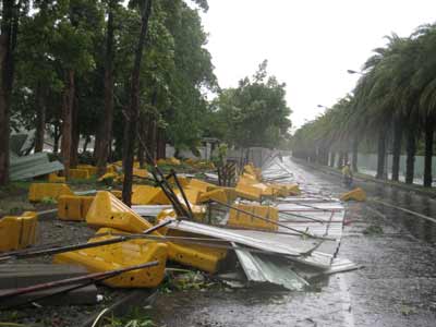 高雄市客家文化園區(qū)新建工程不堪強(qiáng)風(fēng)吹襲,鐵皮圍籬一路倒塌,嚴(yán)重影響車道的暢通。