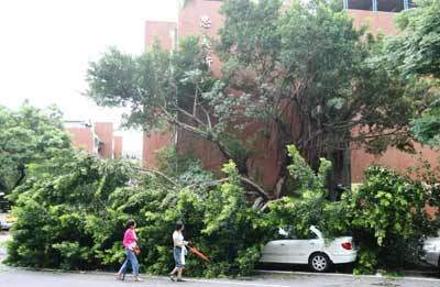 “鳳凰”28日侵襲臺(tái)灣,臺(tái)北市忠誠(chéng)路一段一顆路樹(shù)中午遭強(qiáng)風(fēng)吹斷,擋住了人行道,路過(guò)民眾只好繞道而行。