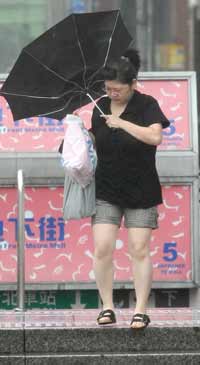 “鳳凰”臺(tái)風(fēng)來(lái)襲,臺(tái)北市街頭不時(shí)出現(xiàn)強(qiáng)風(fēng)讓路過(guò)行人手中的雨傘直接開(kāi)花。