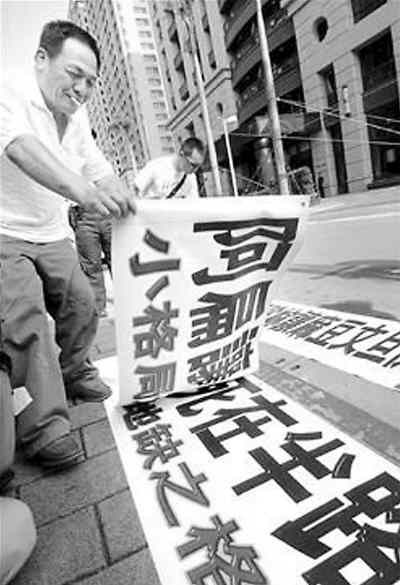 自稱吳淑珍老鄉(xiāng)的施新登(前),在陳水扁家樓下擺放橫幅表示抗議。