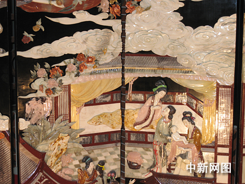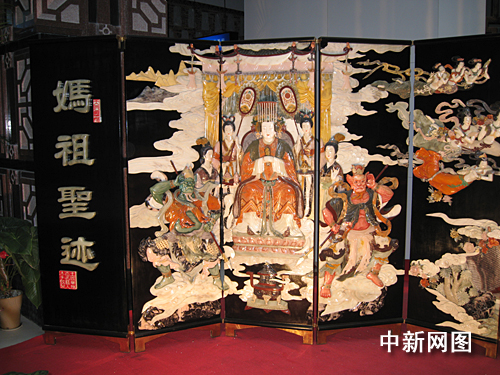 中新網(wǎng)10月25日電 圖為位于中國閩臺緣博物館內(nèi)的巨幅玉石鑲嵌《媽祖》。作品高2米,長30米,歷時5年,采用天然玉、石、珍珠、瑪瑙、翡翠、鉆石鑲嵌。該畫根據(jù)《敕封天后志》、《天后顯圣錄》以及民間有關(guān)媽祖?zhèn)髡f繪成,以連續(xù)不斷的立體與浮雕畫面展現(xiàn)了媽祖救海難、護使節(jié)、解旱治病的圣跡。