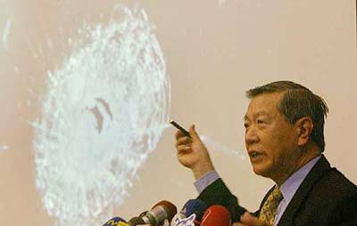李昌鈺博士在離臺前的記者會上公布所采集的槍擊現(xiàn)場相關(guān)鑒識報(bào)告中指出:證據(jù)顯示陳水扁的傷口含有鉛微粒的成份及車窗的彈孔確實(shí)是從外向內(nèi)射擊造成的。