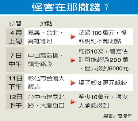 “鬼神啊,十萬(wàn),有夠沒(méi)?”撒錢(qián)怪客陳炳燈昨天在出租車(chē)上一路念念有詞,邊說(shuō)邊往車(chē)外撒錢(qián),司機(jī)葉坤煌覺(jué)得不對(duì)勁,趁他不注意,向警方報(bào)案。