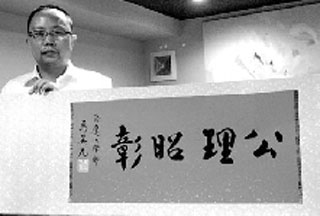 中新網(wǎng)4月21日電 廈門一位普通的律師張海鷹近日得到馬英九的親筆題詞。這幅題有“公理昭彰”四字的1米長卷是馬英九對張海鷹多年幫助臺商的謝禮。