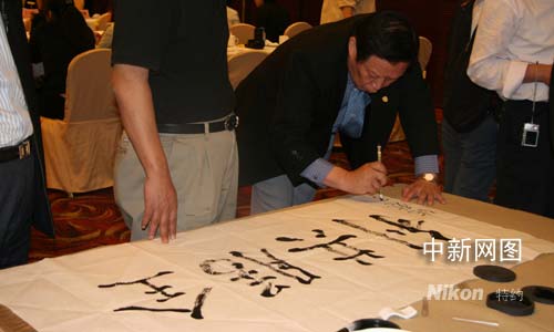 臺灣兵法專家傅慰孤親筆題詞“全勝共贏”遙祝兩岸和平。汪恩民 攝