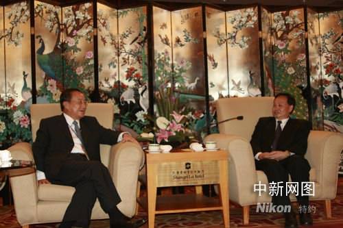 羅清泉(左)與國(guó)臺(tái)辦常務(wù)副主任鄭立中交談。張暢 攝