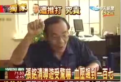 海協(xié)會副會長張銘清在臺遭襲事件,不但令國際震驚,就連臺南人自己也被嚇了一大跳。據(jù)臺灣中時電子報23日消息稱,當(dāng)天擔(dān)任張銘清在孔廟的導(dǎo)游的江文章,說自己當(dāng)時被嚇得腦袋一片空白,后來量血壓,竟然發(fā)現(xiàn)血壓飆高到170。