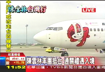 報(bào)道說,臺灣;鶗倍麻L兼秘書長高孔廉率領(lǐng)臺方的接待人員在停機(jī)坪接機(jī)。陳云林在機(jī)場禮遇通關(guān)直接驅(qū)車前往下榻的圓山飯店。