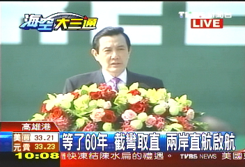 馬英九說(shuō):“兩岸直航所代表的意義,一方面代表兩岸的和解,不再走過(guò)去對(duì)立沖突的路線,也就是說(shuō),我們用談判取代對(duì)立,以和解取代沖突,兩岸共同謀求和平與繁榮。而從經(jīng)濟(jì)面來(lái)看,兩岸直航,在空運(yùn)方面可節(jié)省大量時(shí)間,估計(jì)超過(guò)30億元,在海運(yùn)方面也是一樣,每一個(gè)航次可節(jié)省16到27個(gè)小時(shí)!