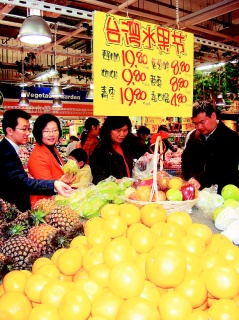 中新網(wǎng)3月24日電 據(jù)臺(tái)灣《聯(lián)合報(bào)》報(bào)道,兩岸實(shí)現(xiàn)“大三通”后航運(yùn)時(shí)間大幅縮短,運(yùn)輸成本也降低,讓臺(tái)灣水果在大陸重啟生機(jī)。上海百聯(lián)集團(tuán)旗下世紀(jì)聯(lián)華超市近日推出“臺(tái)灣水果節(jié)”活動(dòng),大力促銷臺(tái)灣水果,不但水果出貨時(shí)間比過(guò)去縮短一半以上,水果新鮮度得以保持,售價(jià)也比過(guò)去便宜30%,讓臺(tái)灣水果更具競(jìng)爭(zhēng)力。