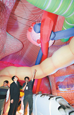 記者先走入“格列佛人體藝術(shù)探索館”一探究竟,從巨大的腳掌進入,首先映入眼簾是大腿骨和腳掌骨,充滿普普藝術(shù)的彩繪風格;創(chuàng)意團隊將小腸化身為LED燈的迷宮隧道,還能看到跳動的心臟,利用氣球制造肺部呼吸頻率,栩栩如生。