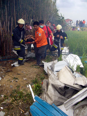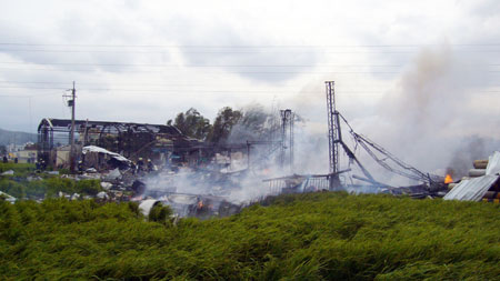 消防人員冒著大火到火場內(nèi)灌救,火場不斷傳出小型爆炸,十分嚇人,而現(xiàn)場馬路上都布滿工廠飛出的鐵皮與鋼架,連附近民家玻璃屋頂都震破得十分嚴(yán)重,滿目所見都是殘破現(xiàn)象,還有一位傷者震飛到三十多米的稻田草叢中,是被到場記者聽到哀嚎聲才通報搶救,現(xiàn)場慘不忍睹。