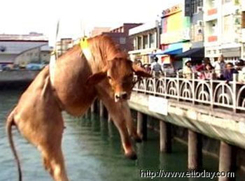 大黃牛拼命仰著頭不讓海水淹過口鼻,在水里載浮載沉,狼狽的任由脖子上的繩索拉著走。好不容易靠近岸邊,幾個(gè)人接力試圖將大黃牛拉上石階,但或許是因?yàn)槠咦彀松嗟挠懻撀暫蛧^民眾關(guān)愛的眼神,讓大黃牛嚇到動(dòng)都不敢動(dòng),最后只能請助消防隊(duì)出動(dòng)吊車。