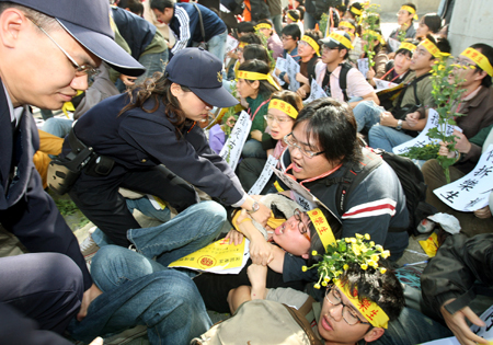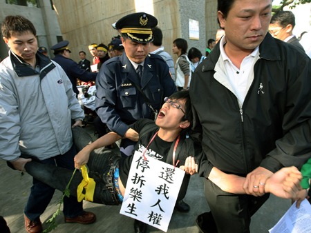 據臺灣媒體報道,抗議者每人手持一枝菊花,并高舉訴求布條,在園區(qū)門前集結訴求“反迫遷,定古跡”。隨后警方強制驅離靜坐人士,共有約四十名靜坐者與一名樂生院民被帶往警局。
