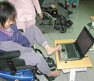 十八年前黃美秀讀埔里中學(xué)資源班,老師鼓勵(lì)她學(xué)電腦,六十六歲的祖母每晚陪她去上課,剛開始練習(xí)用腳趾按鍵盤、撥動(dòng)鼠標(biāo),腳上好像綁著大石頭,苦練一星期后,熟練與靈活度已比“正!蓖瑢W(xué)還要好,F(xiàn)在她的黃金左腳,大小趾并用,一分鐘可輸入二十個(gè)字。