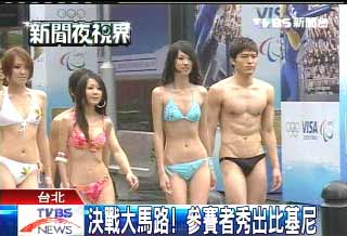 中新網(wǎng)4月29日電 據(jù)臺(tái)灣TVBS報(bào)道,臺(tái)北東區(qū)街頭28日下午出現(xiàn)清涼秀,電視比賽節(jié)目“決戰(zhàn)第一名”22名參賽者,把舞臺(tái)搬到大馬路上,直接把班馬線當(dāng)伸展臺(tái)走,參賽者身上只穿單薄比基尼走秀,路旁的行人則干脆拿手機(jī)拼命拍。
