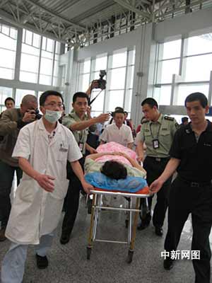在汶川地震中受傷的臺胞韓聲璧20日下午搭乘臺灣華信航空公司的包機返回臺灣 民生提供