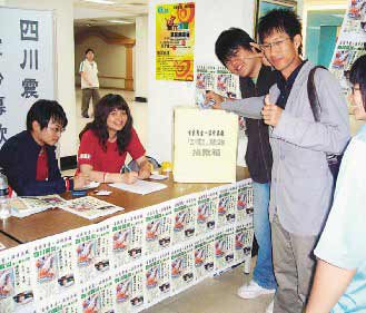 中新網(wǎng)5月22日電 “10元、百元不嫌少,援助災(zāi)民要趁早!”四川震災(zāi),讓來(lái)自南投九二一災(zāi)區(qū)的玄奘大學(xué)教育人力資源系學(xué)生蕭楷庭感同身受,學(xué)生社團(tuán)發(fā)起愛(ài)心救災(zāi),他毫不猶豫捐了1000元(新臺(tái)幣,下同)的零用錢(qián)。
