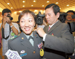 臺灣第4位女將軍池玉蘭(左)由同為將軍退伍的丈夫黃振遠(右)戴上新的官階,締造臺灣首對將軍夫婦的紀錄。(圖:臺灣《中國時報》)