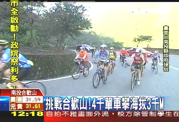 據(jù)臺(tái)灣TVBS報(bào)道,4000多輛自行車挑戰(zhàn)合歡山,出了市區(qū),上山路全是難關(guān)。合歡山公路超大斜坡,開車的只要輕踩油門,但這些自行車騎士踩踏板的頻率已經(jīng)像在跑步,卻只能緩慢爬升。