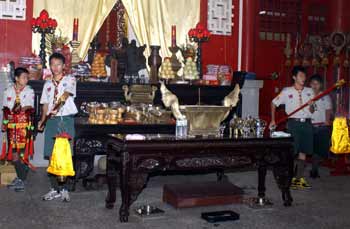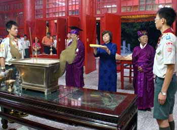 中新網(wǎng)9月28日電 08年嘉義市各界紀(jì)念大成至圣先師誕辰釋奠典禮今天上午如期在嘉義公園內(nèi)孔廟舉行。因薔薇臺(tái)風(fēng)來襲,顧及學(xué)生安全,今年首度取消佾舞,并創(chuàng)下由童軍擔(dān)任禮生的先例。不少民眾和小朋友冒著風(fēng)雨到場(chǎng)觀禮,并在祀典后領(lǐng)取智能糕,期能增長(zhǎng)智能、學(xué)業(yè)進(jìn)步。