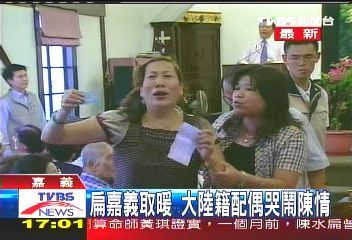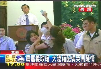 據(jù)臺(tái)灣TVBS報(bào)道,陳水扁到嘉義“長(zhǎng)老教會(huì)”,場(chǎng)內(nèi)話才講一半,一名大陸配偶沖上臺(tái)哭訴;陳水扁用手擦去眉頭上的汗,場(chǎng)面十分尷尬。