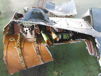 空軍編號一六一五IDF雙座戰(zhàn)機,前天上午飛到澎湖草嶼石礁靶場炸射時失聯(lián),兩名飛行員失蹤。軍方昨天撈獲疑似IDF左、右襟副翼及零組件、高壓氣瓶、機炮自動馬達及發(fā)動機下方掛點等殘骸,不是斷裂就是嚴(yán)重扭曲,未見爆炸痕跡,軍方分析“戰(zhàn)機撞擊海面造成”。