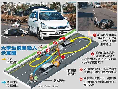 警方調(diào)查,這起駭人聽聞的大學(xué)生三角戀情殺案,三人是觀光系同班同學(xué);不幸被輾死的劉芳瑜(二十歲)和嫌犯洪琦(二十一歲)曾是班對,交往兩年多。八月間,因個性不合分手,劉女另與同學(xué)顏嘉德(二十一歲)交往。