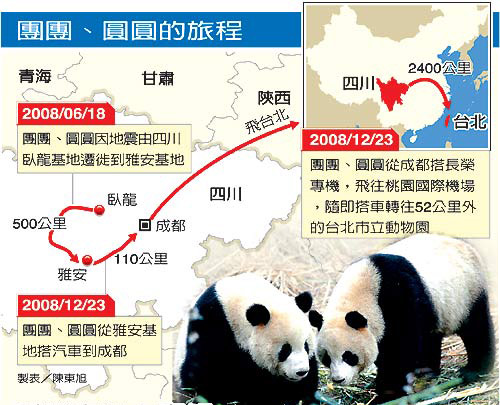 熊貓團(tuán)團(tuán)圓圓將抵臺(tái)。提早到四川熟悉照顧熊貓的臺(tái)北市立動(dòng)物園飼養(yǎng)員游雪音,將擔(dān)負(fù)引兩只熊貓入籠的重任,她認(rèn)為,團(tuán)團(tuán)憨厚、圓圓精明,任務(wù)確有挑戰(zhàn)性。